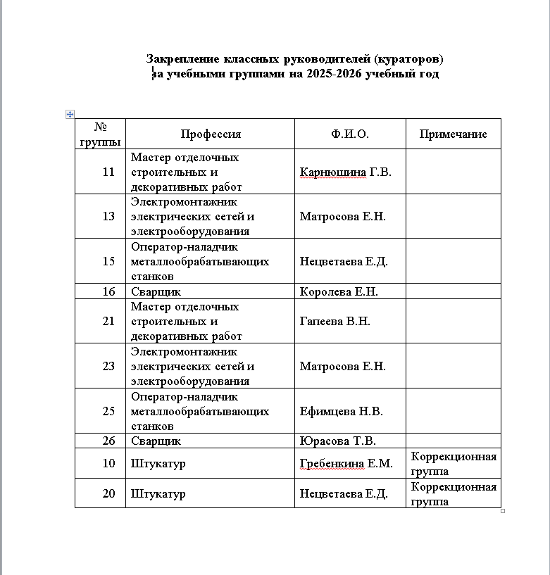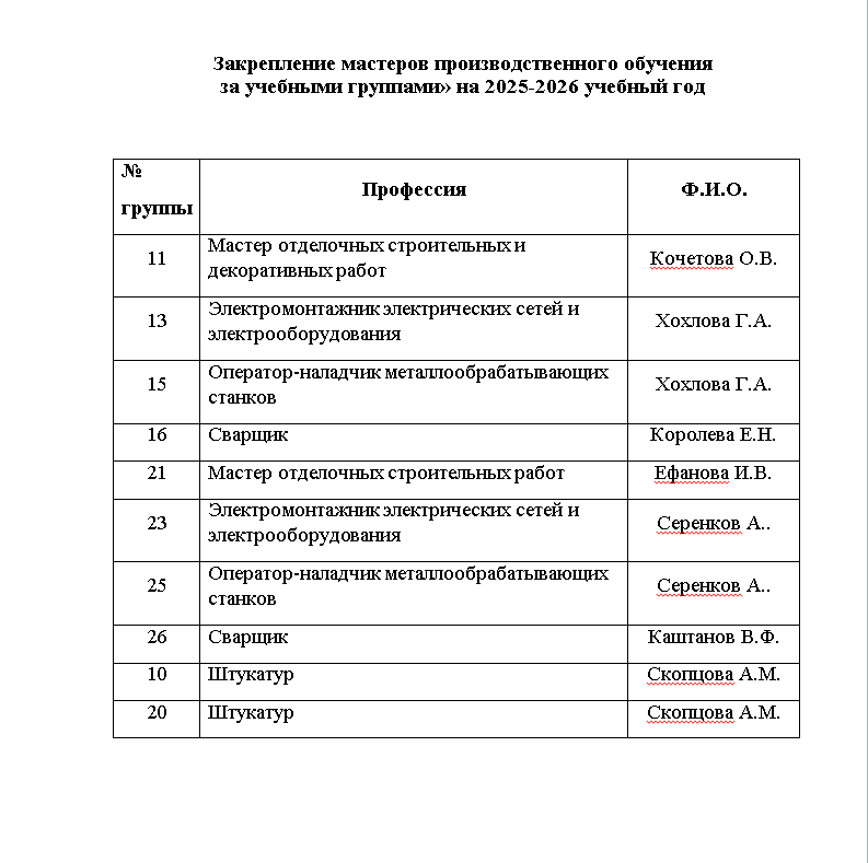 • Список классных руководителей (кураторов) и мастеров производственного обучения